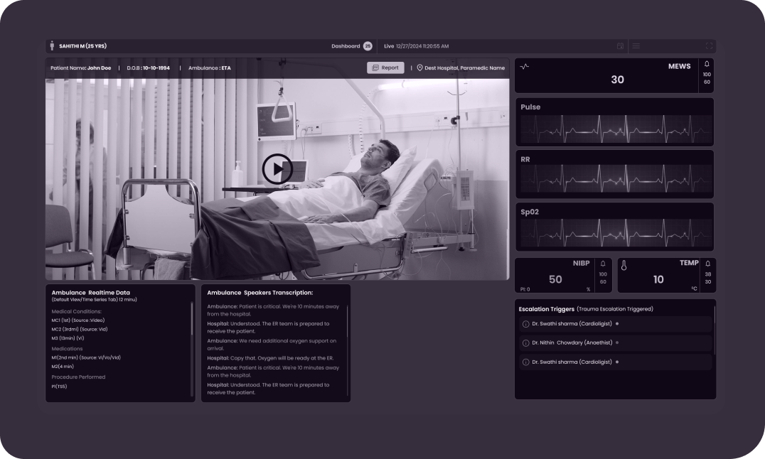 Our Embedded Ambient AI continuously collects vitals, voice, and video data, analyzing it through Clinical AI, Voice AI, and Vision AI engines. This multimodal approach correlates patient data, delivering deep insights, intelligent alerts, and clinical decision support in real-time. By reducing manual documentation and cognitive load, our system helps doctors, nurses, and paramedics focus on critical care while improving efficiency.